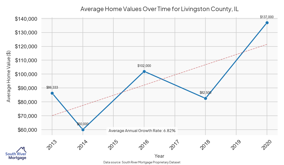 In 2024, there were 8 active reverse mortgage loans in Livingston County, Illinois. The average home value in Livingston County is $127,157.38.