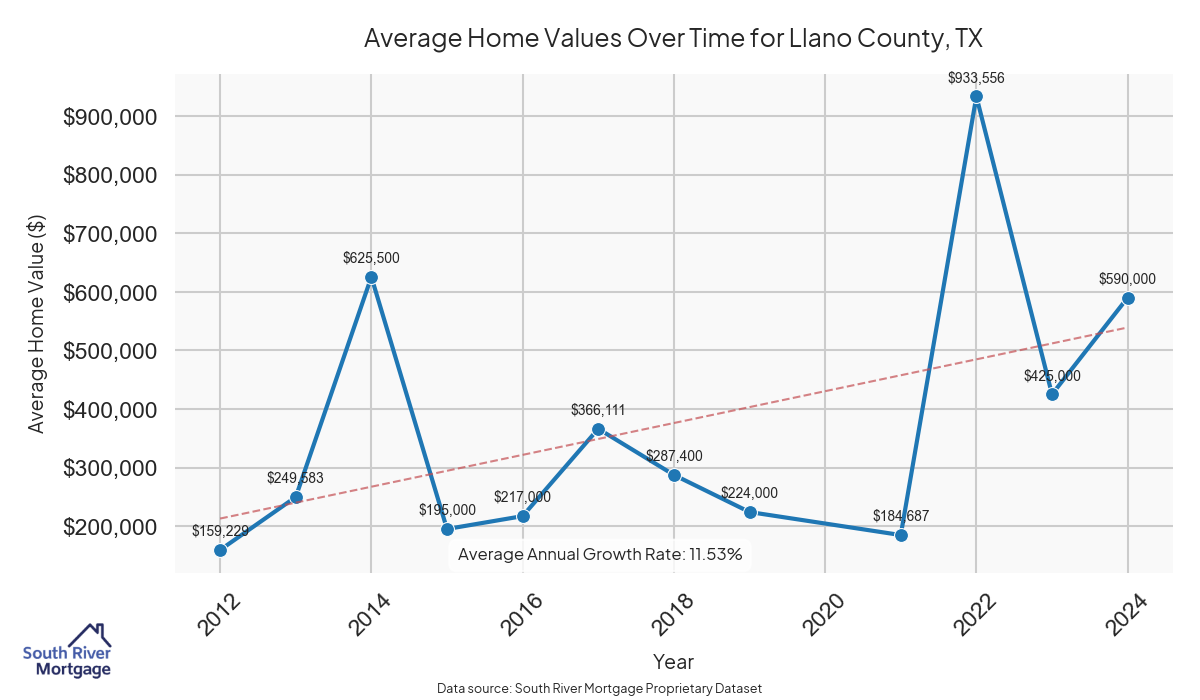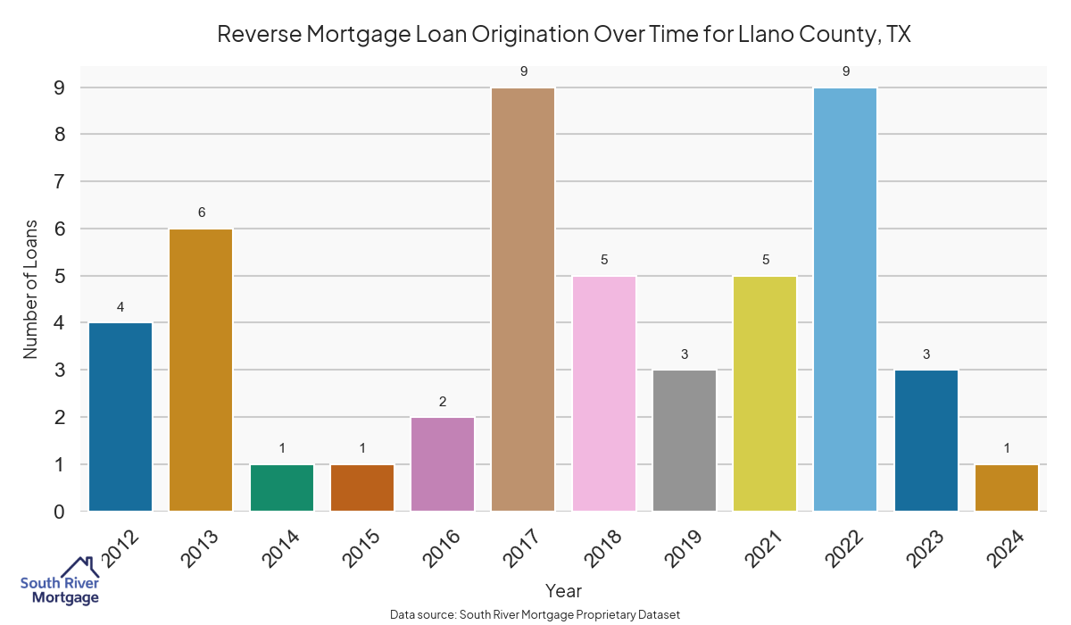 There are approximately 47 active reverse mortgage loans in Llano County. The average interest rate in Llano County is 6.4% for reverse mortgages. The average maximum claim amount (the lesser of the appraisal or lending limit), among reverse mortgage borrowers, in Llano County was $403,000.00 in 2024.