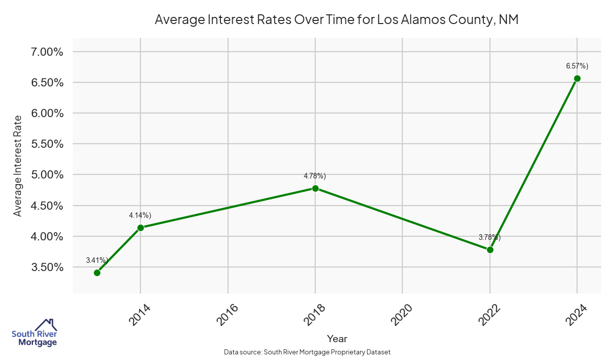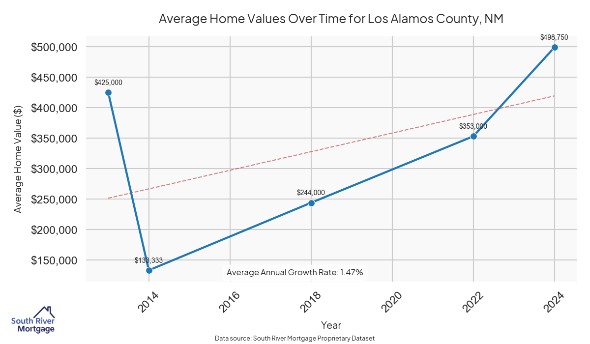 There are approximately 9 active reverse mortgage loans in Los Alamos County. The average interest rate in Los Alamos County is 6.84% for reverse mortgages. The average maximum claim amount (the lesser of the appraisal or lending limit), among reverse mortgage borrowers, in Los Alamos County was $405,000.00 in 2024.