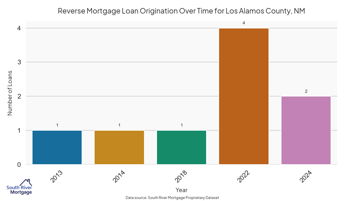 In 2024, there were 9 active reverse mortgage loans in Los Alamos County, New Mexico. The average home value in Los Alamos County is $482,410.67.