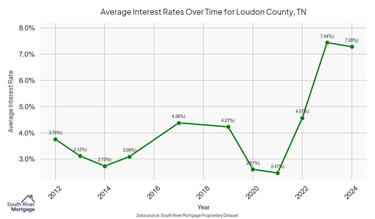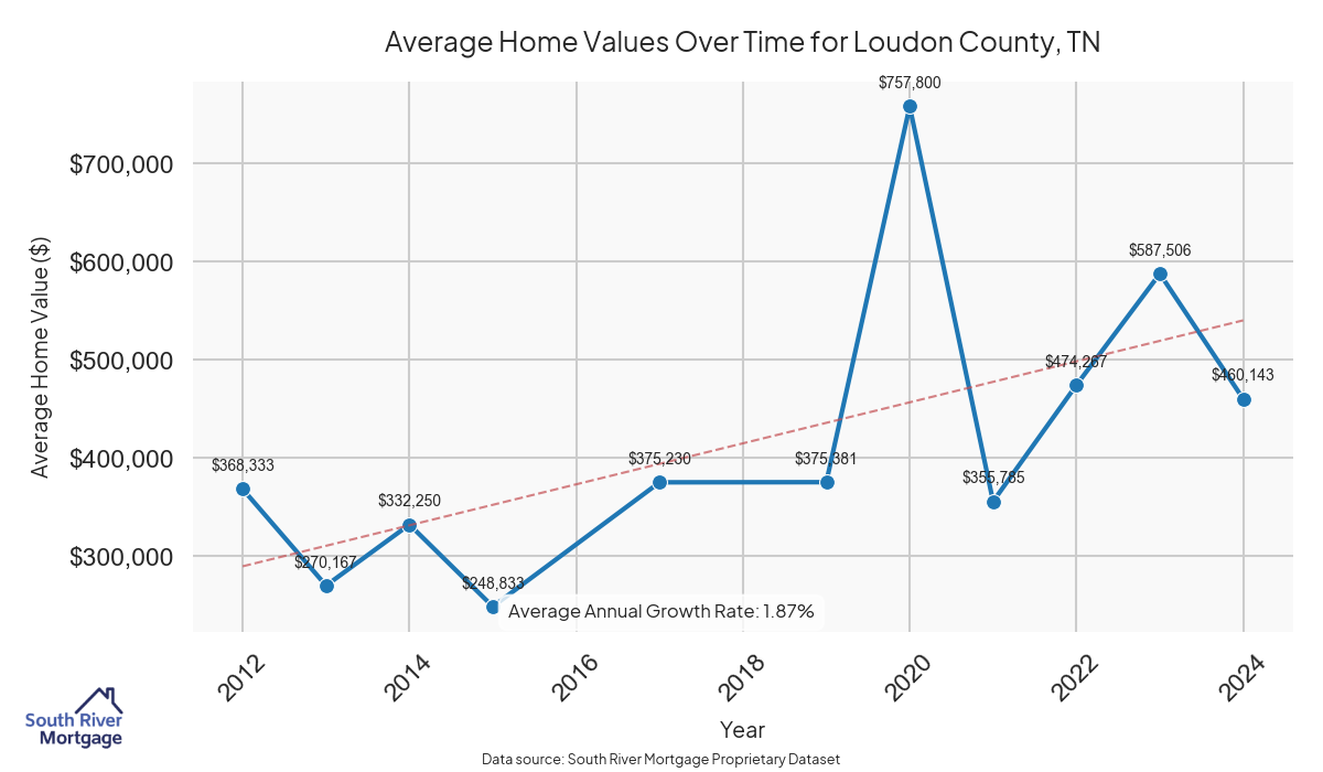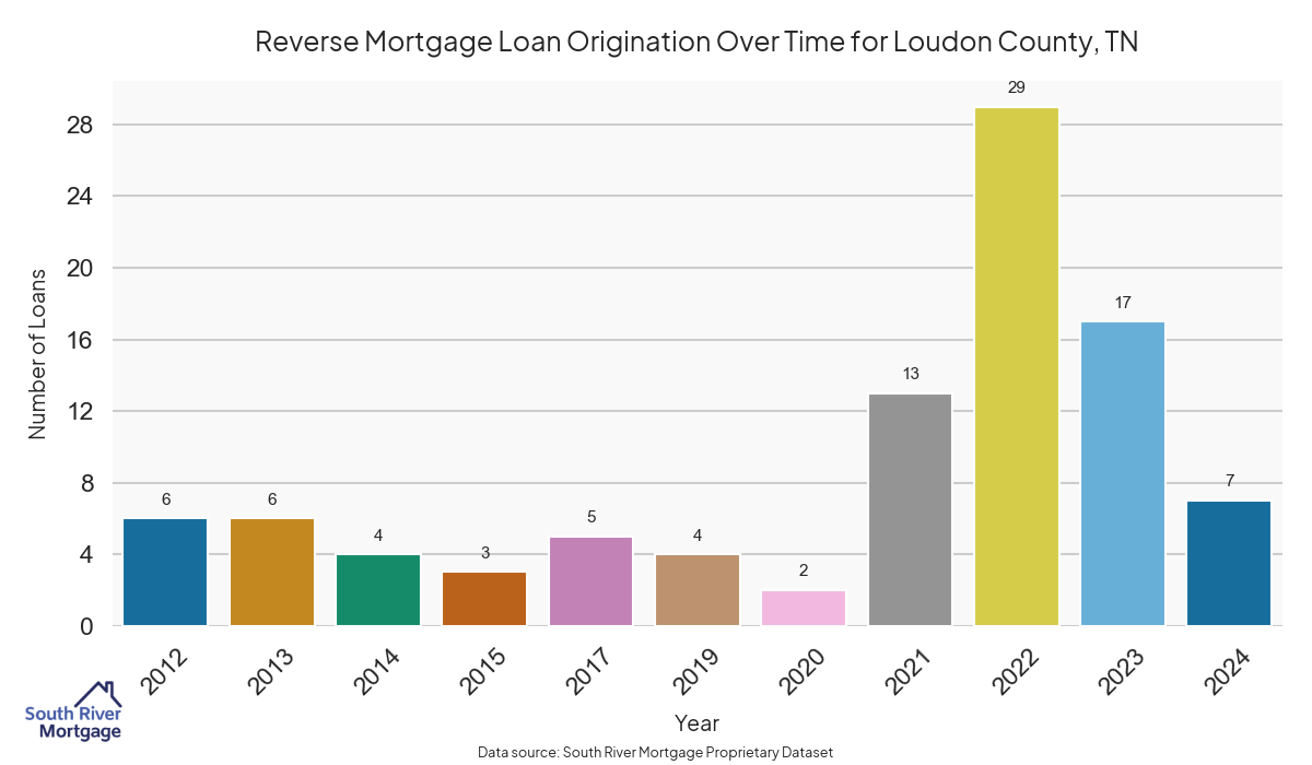 In 2024, there were 95 active reverse mortgage loans in Loudon County, Tennessee. The average home value in Loudon County is $598,686.19.