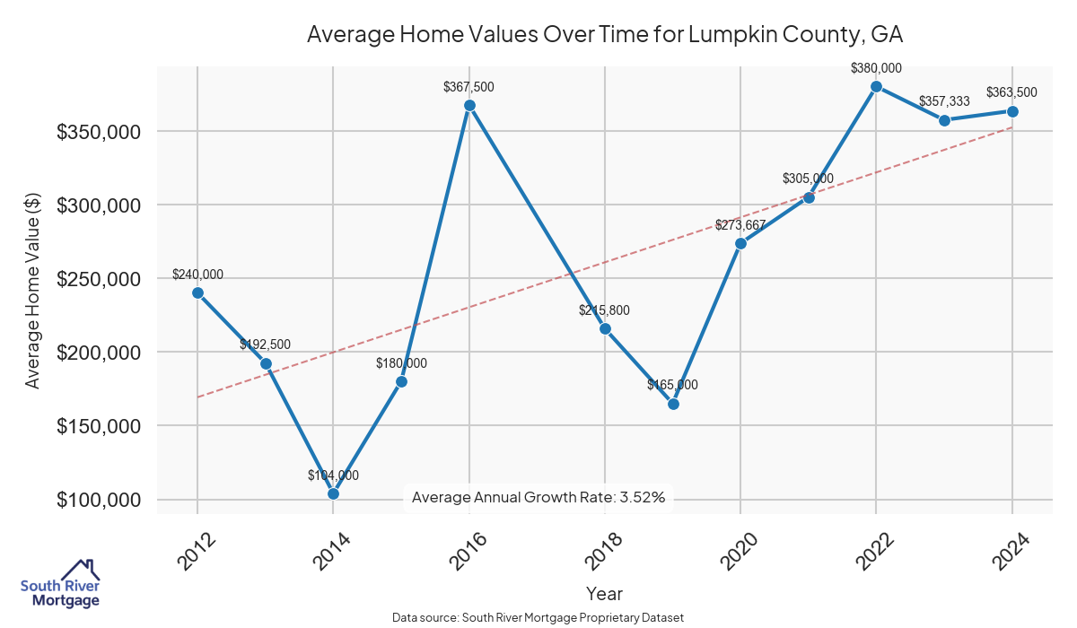 In 2024, there were 26 active reverse mortgage loans in Lumpkin County, Georgia. The average home value in Lumpkin County is $408,029.65.