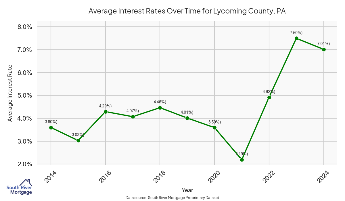 There are approximately 69 active reverse mortgage loans in Lycoming County. The average interest rate in Lycoming County is 7.72% for reverse mortgages. The average maximum claim amount (the lesser of the appraisal or lending limit), among reverse mortgage borrowers, in Lycoming County was $285,000.00 in 2024.