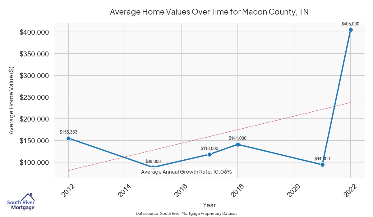 In 2024, there were 8 active reverse mortgage loans in Macon County, Tennessee. The average home value in Macon County is $219,448.13.