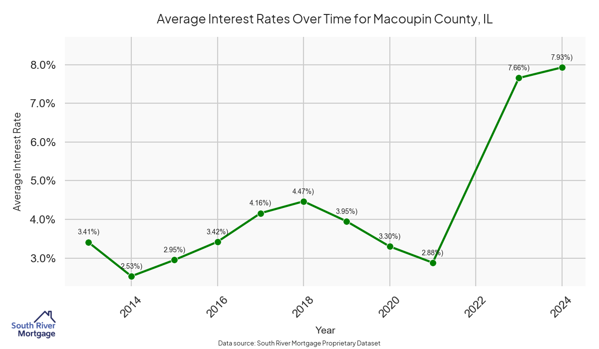 There are approximately 15 active reverse mortgage loans in Macoupin County. The average interest rate in Macoupin County is 7.66% for reverse mortgages. The average maximum claim amount (the lesser of the appraisal or lending limit), among reverse mortgage borrowers, in Macoupin County was $181,666.67 in 2024.