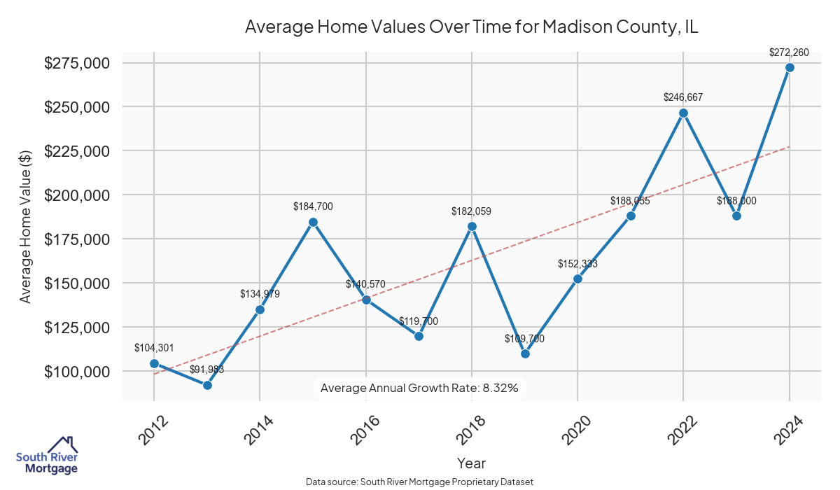 In 2024, there were 101 active reverse mortgage loans in Madison County, Illinois. The average home value in Madison County is $268,932.55.