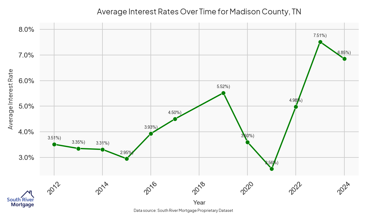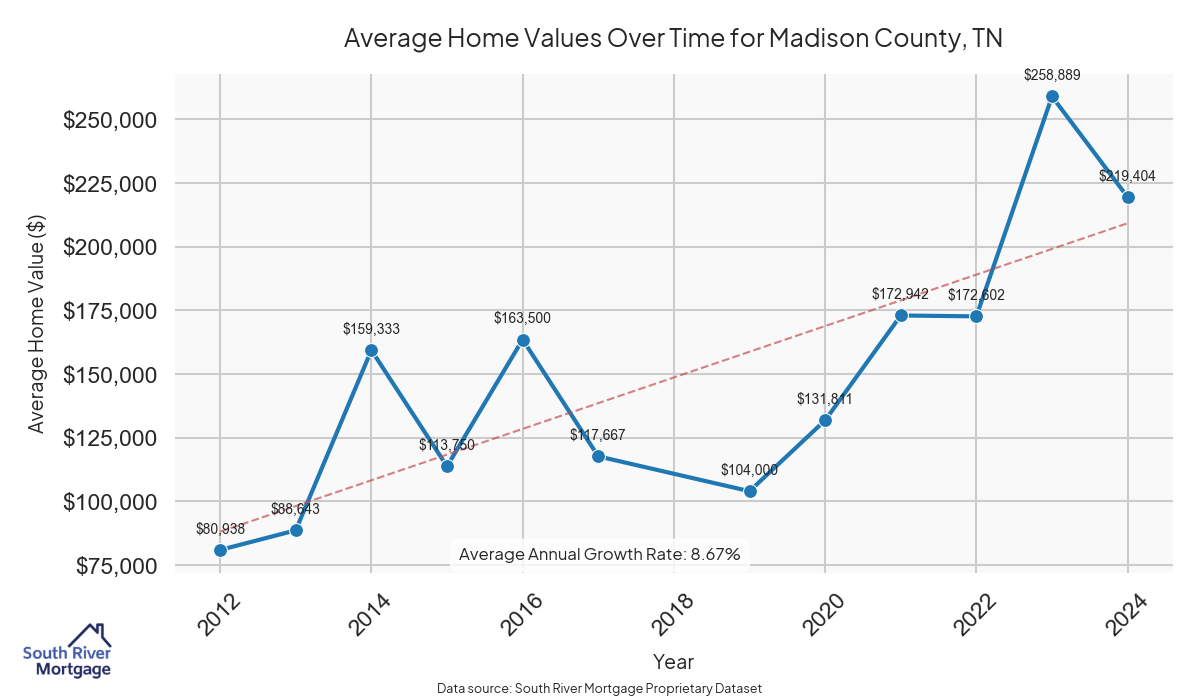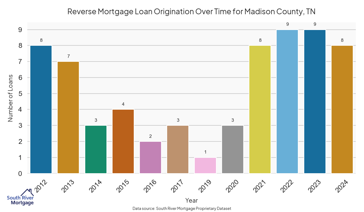 In 2024, there were 63 active reverse mortgage loans in Madison County, Tennessee. The average home value in Madison County is $260,795.75.
