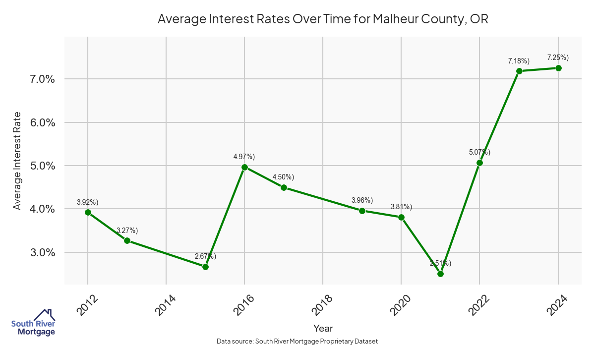 There are approximately 34 active reverse mortgage loans in Malheur County. The average interest rate in Malheur County is 7.44% for reverse mortgages. The average maximum claim amount (the lesser of the appraisal or lending limit), among reverse mortgage borrowers, in Malheur County was $265,000.00 in 2024.
