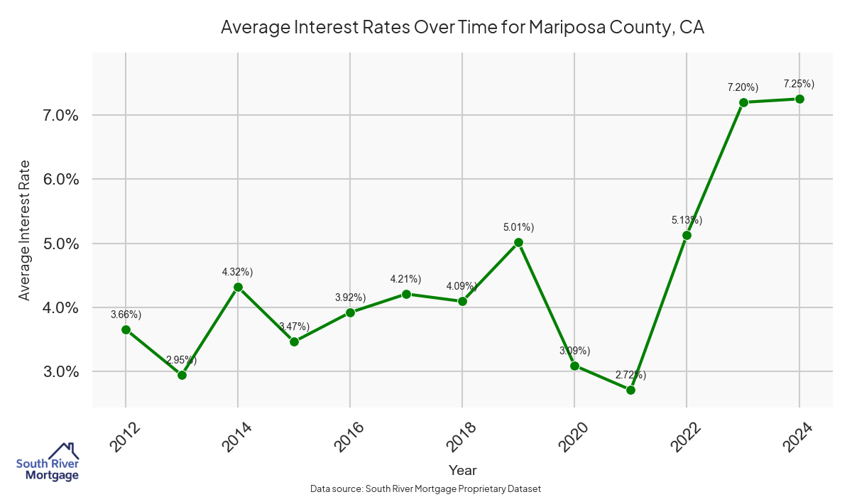 There are approximately 44 active reverse mortgage loans in Mariposa County. The average interest rate in Mariposa County is 7.35% for reverse mortgages. The average maximum claim amount (the lesser of the appraisal or lending limit), among reverse mortgage borrowers, in Mariposa County was $360,000.00 in 2024.