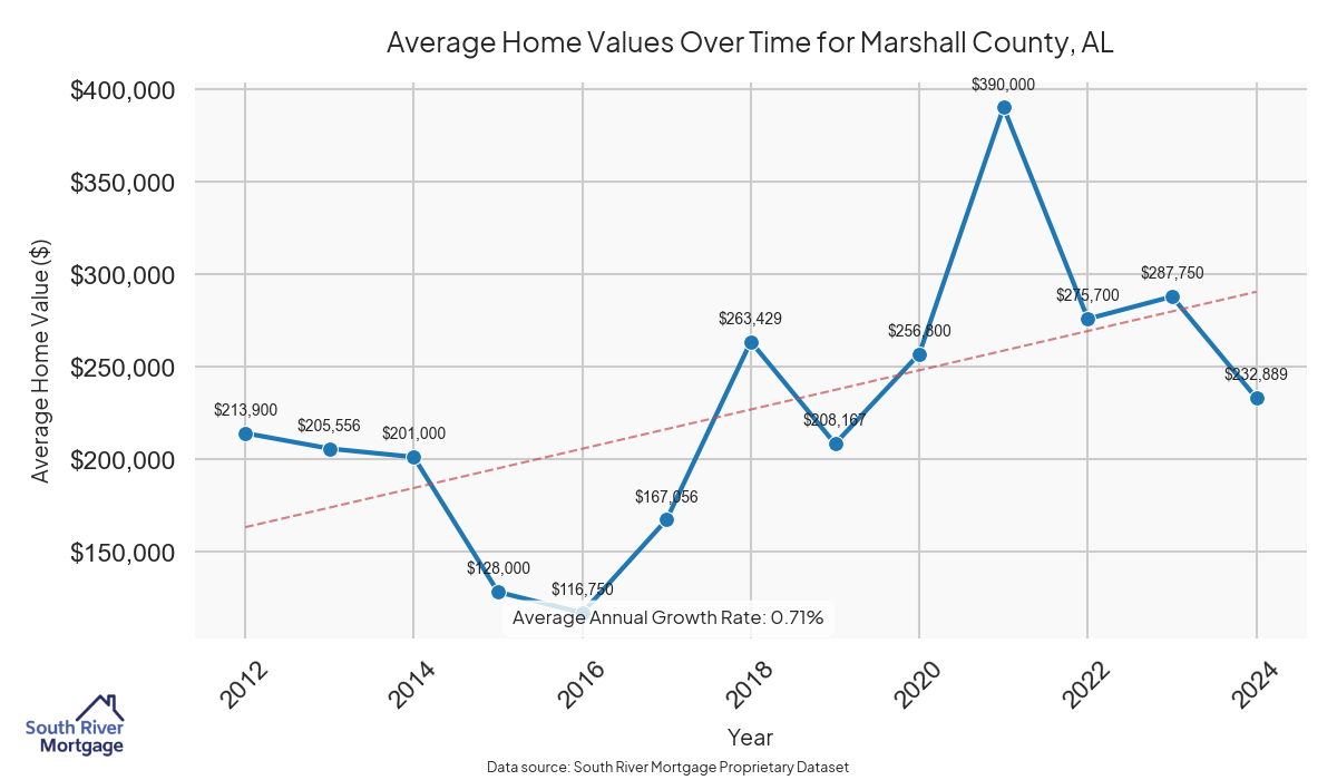 In 2024, there were 84 active reverse mortgage loans in Marshall County, Alabama. The average home value in Marshall County is $280,633.92.