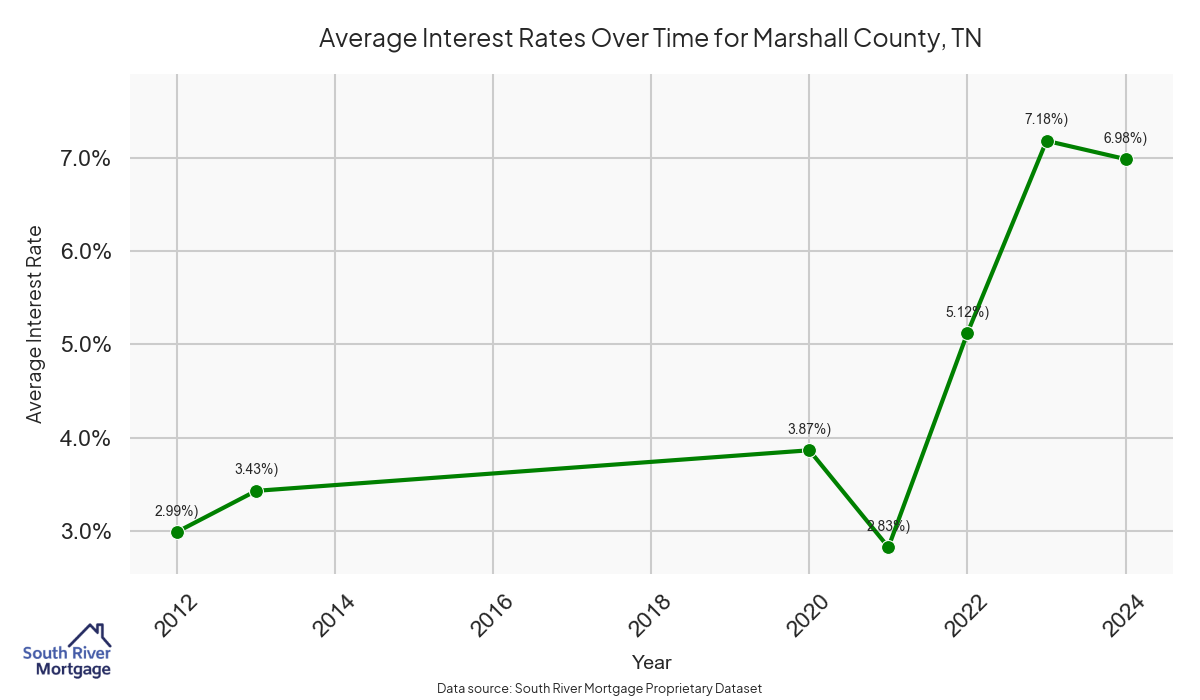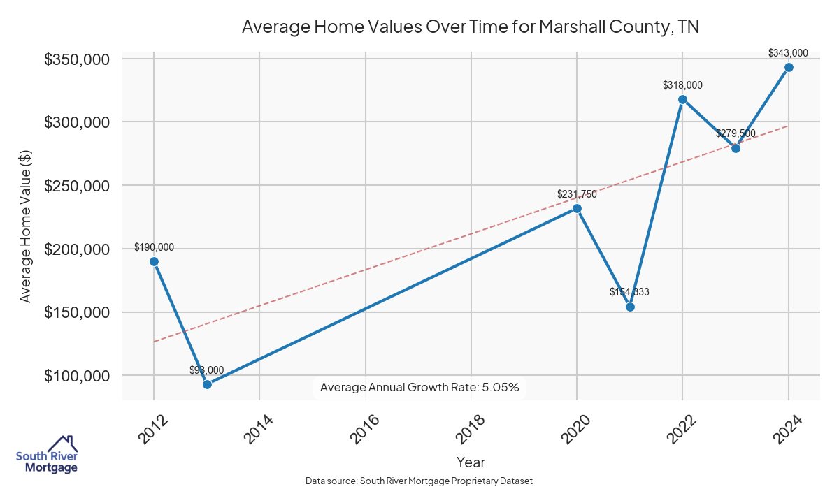 In 2024, there were 24 active reverse mortgage loans in Marshall County, Tennessee. The average home value in Marshall County is $328,272.92.
