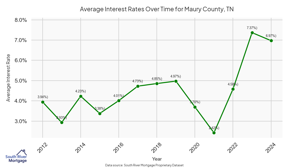 There are approximately 110 active reverse mortgage loans in Maury County. The average interest rate in Maury County is 7.39% for reverse mortgages. The average maximum claim amount (the lesser of the appraisal or lending limit), among reverse mortgage borrowers, in Maury County was $472,931.03 in 2024.
