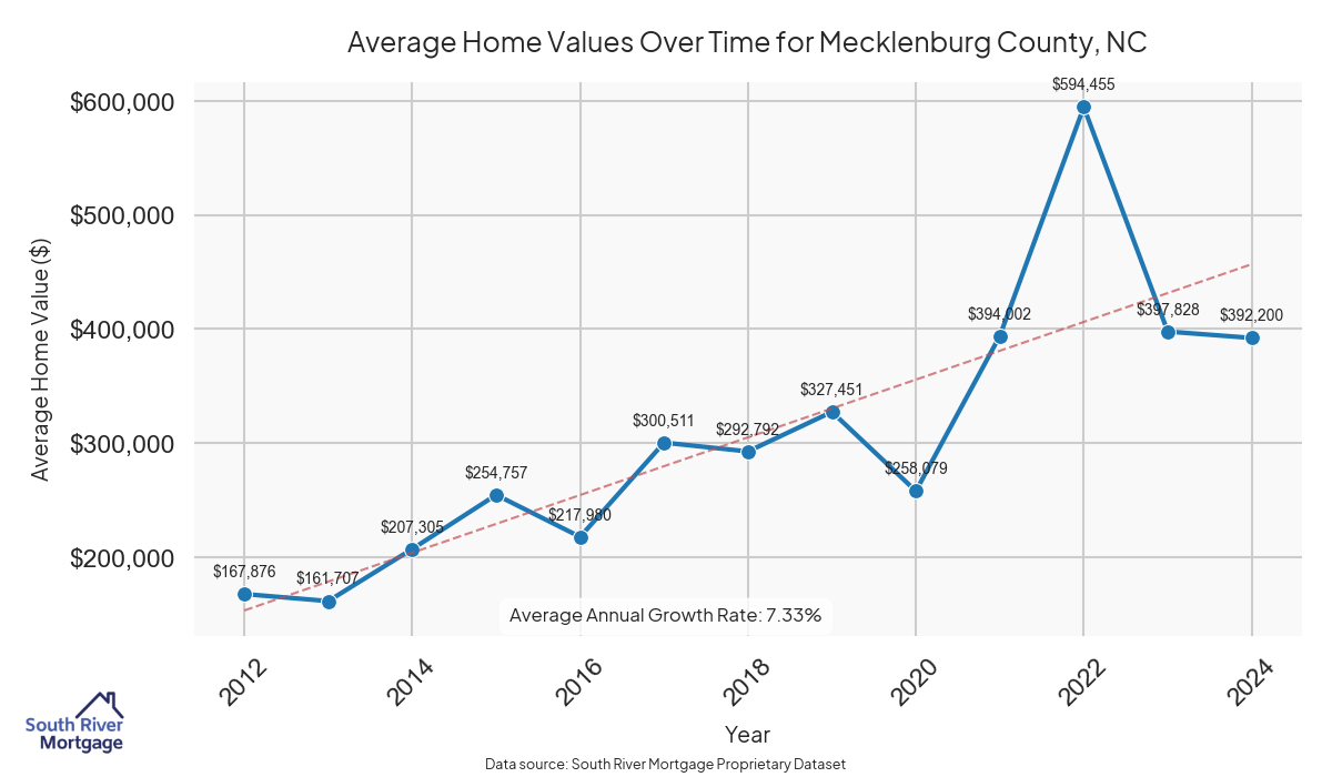 There are approximately 942 active reverse mortgage loans in Mecklenburg County. The average interest rate in Mecklenburg County is 7.49% for reverse mortgages. The average maximum claim amount (the lesser of the appraisal or lending limit), among reverse mortgage borrowers, in Mecklenburg County was $442,516.78 in 2024.