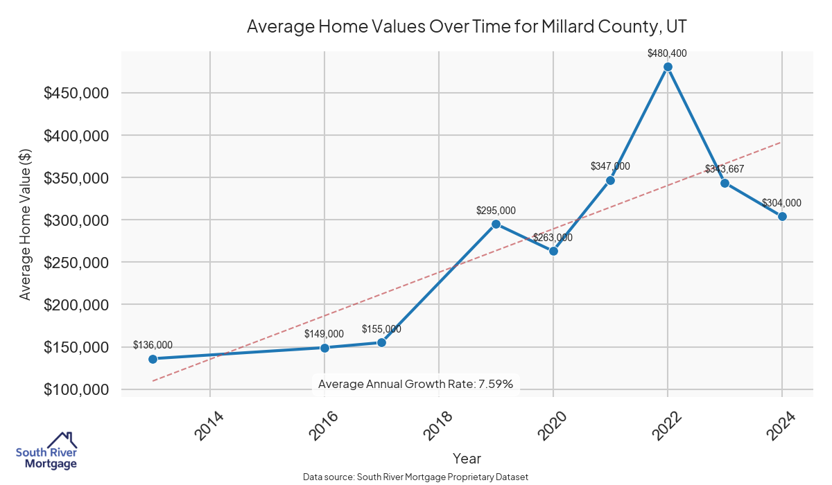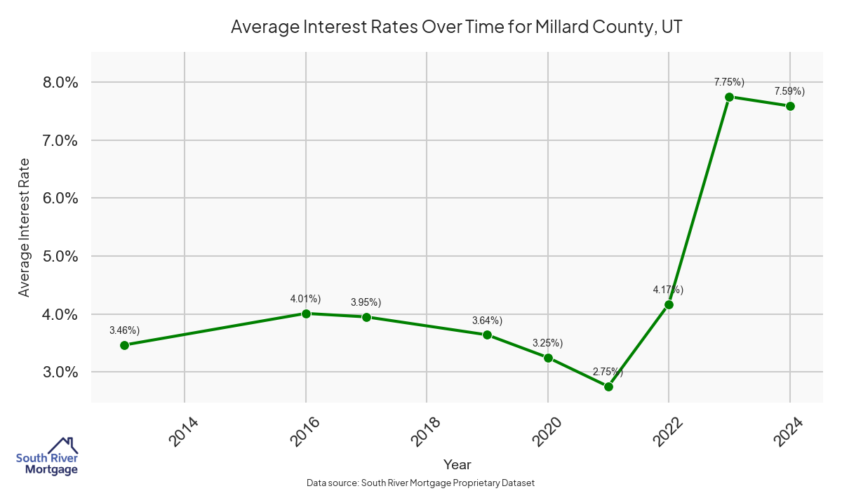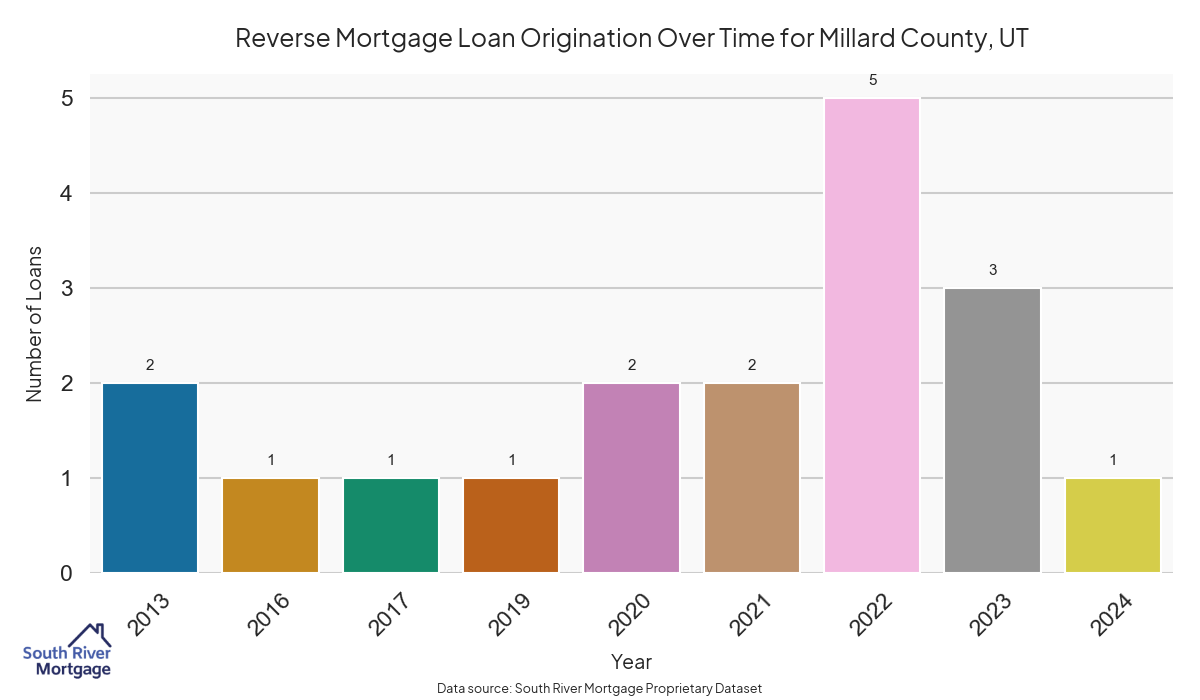 There are approximately 15 active reverse mortgage loans in Millard County. The average interest rate in Millard County is 7.71% for reverse mortgages. The average maximum claim amount (the lesser of the appraisal or lending limit), among reverse mortgage borrowers, in Millard County was $342,500.00 in 2024.