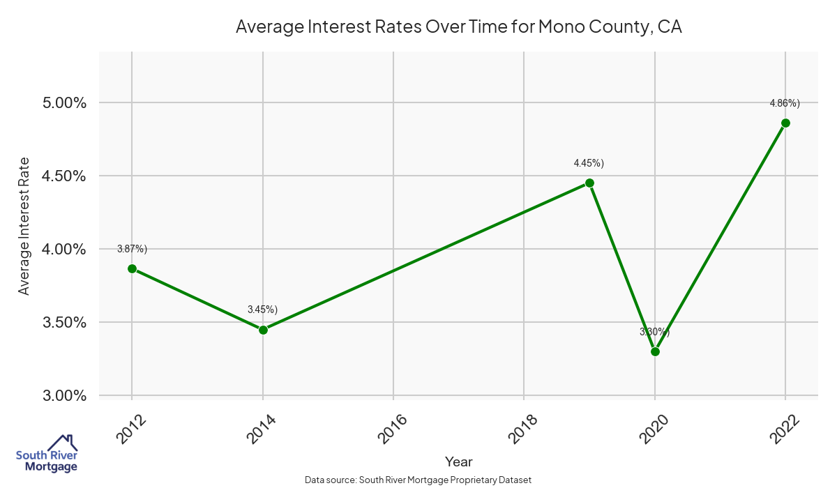There are approximately 12 active reverse mortgage loans in Mono County. The average interest rate in Mono County is 7.81% for reverse mortgages. The average maximum claim amount (the lesser of the appraisal or lending limit), among reverse mortgage borrowers, in Mono County was $255,000.00 in 2024.