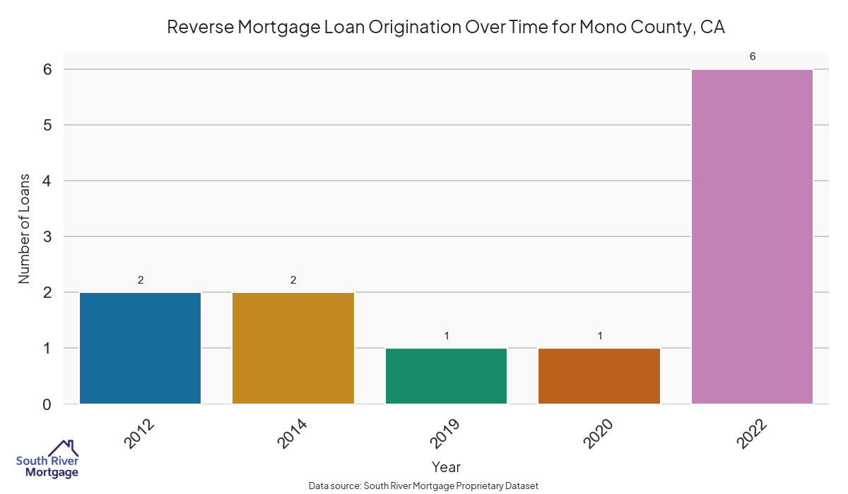 In 2024, there were 12 active reverse mortgage loans in Mono County, California. The average home value in Mono County is $816,219.42.