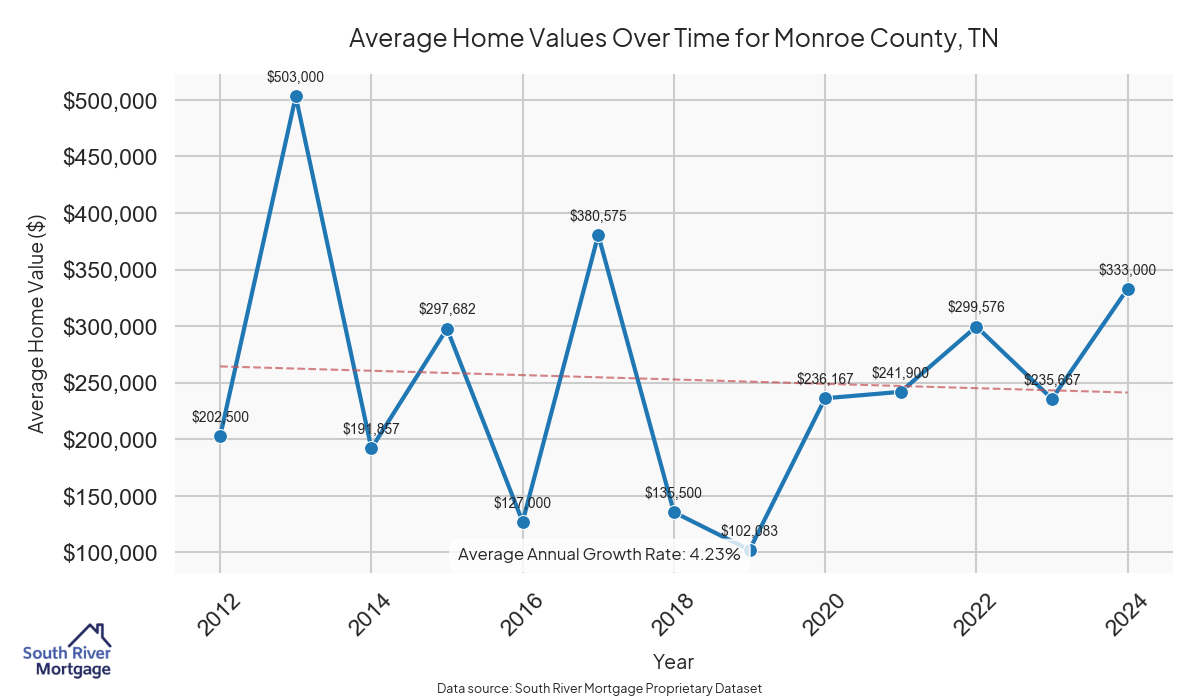 In 2024, there were 50 active reverse mortgage loans in Monroe County, Tennessee. The average home value in Monroe County is $282,936.02.