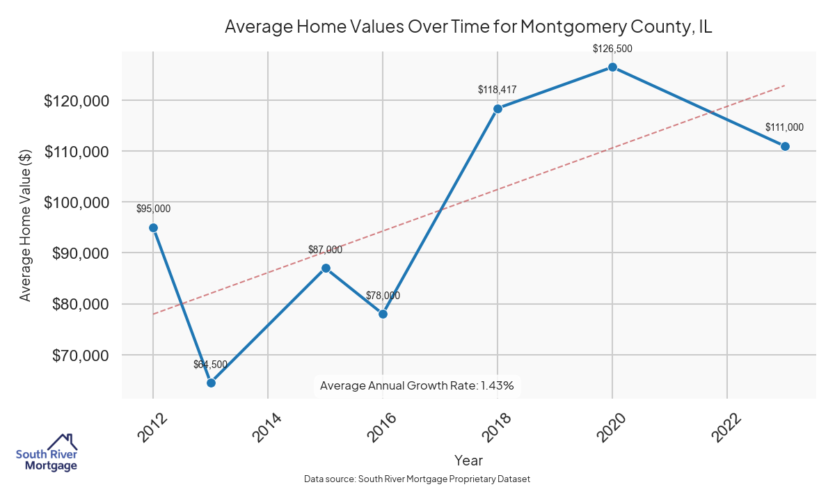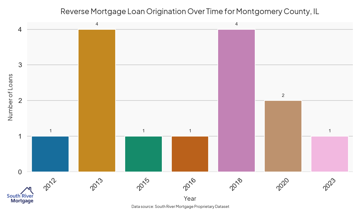In 2024, there were 14 active reverse mortgage loans in Montgomery County, Illinois. The average home value in Montgomery County is $196,227.29.