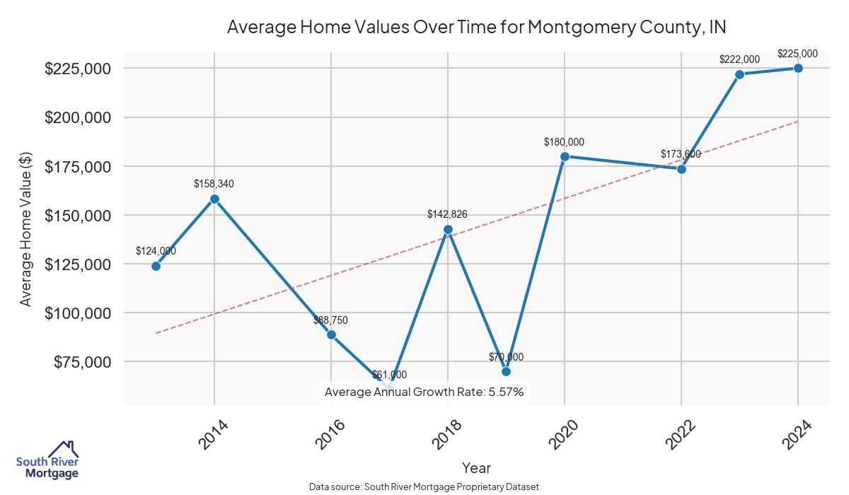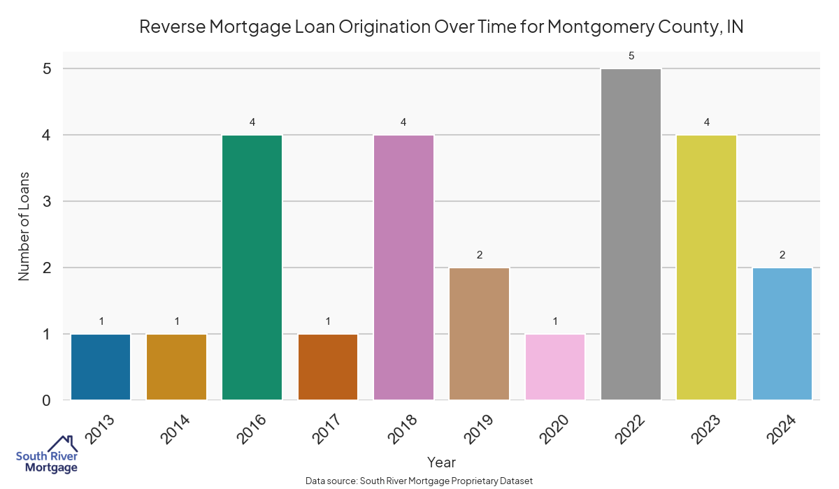 In 2024, there were 23 active reverse mortgage loans in Montgomery County, Indiana. The average home value in Montgomery County is $242,660.00.
