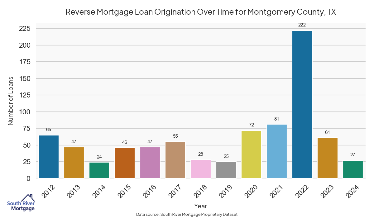 In 2024, there were 792 active reverse mortgage loans in Montgomery County, Texas. The average home value in Montgomery County is $446,492.22.