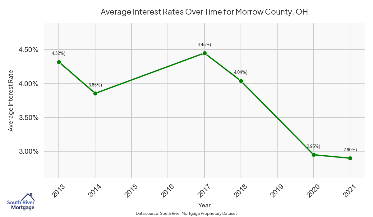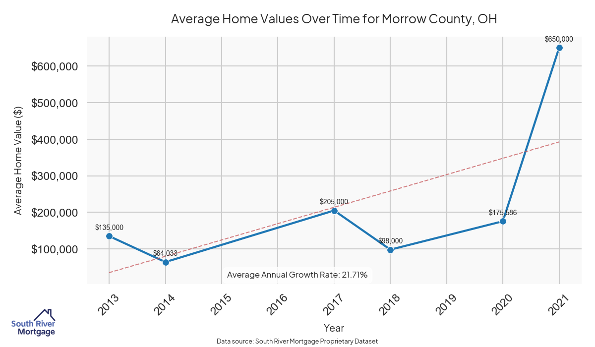 In 2024, there were 8 active reverse mortgage loans in Morrow County, Ohio. The average home value in Morrow County is $310,752.38.