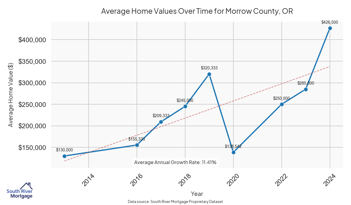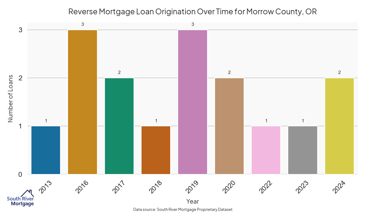 In 2024, there were 15 active reverse mortgage loans in Morrow County, Oregon. The average home value in Morrow County is $395,820.80.