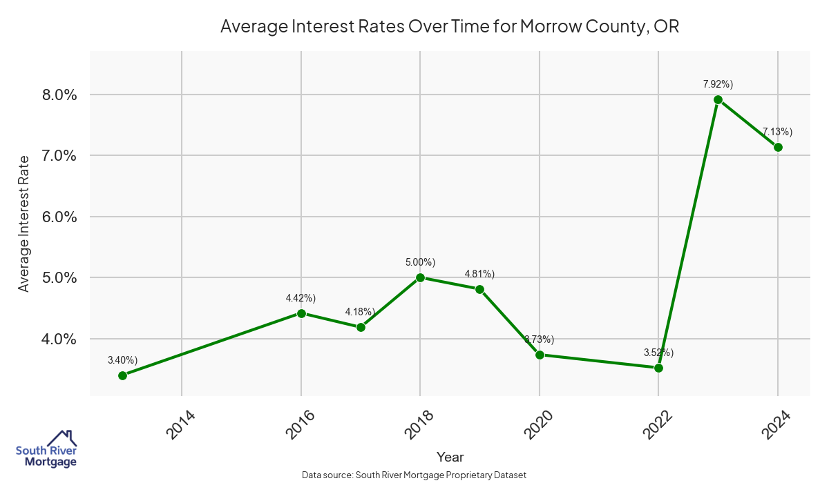 There are approximately 15 active reverse mortgage loans in Morrow County. The average interest rate in Morrow County is 7.92% for reverse mortgages. The average maximum claim amount (the lesser of the appraisal or lending limit), among reverse mortgage borrowers, in Morrow County was $285,000.00 in 2024.