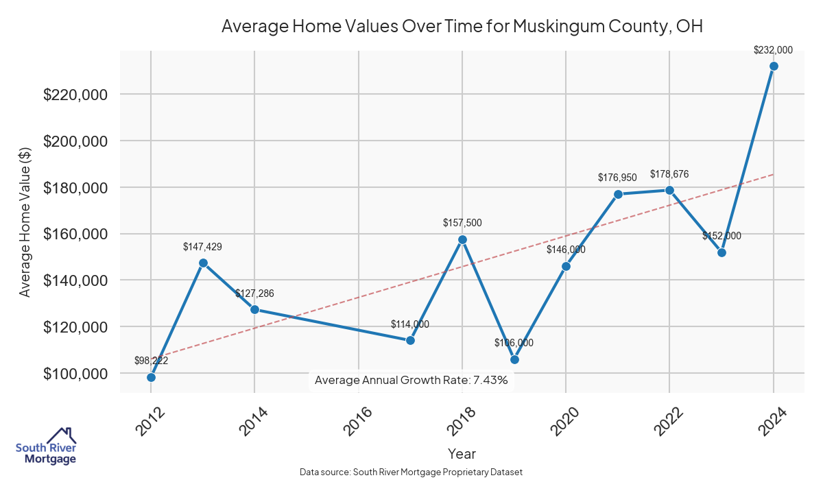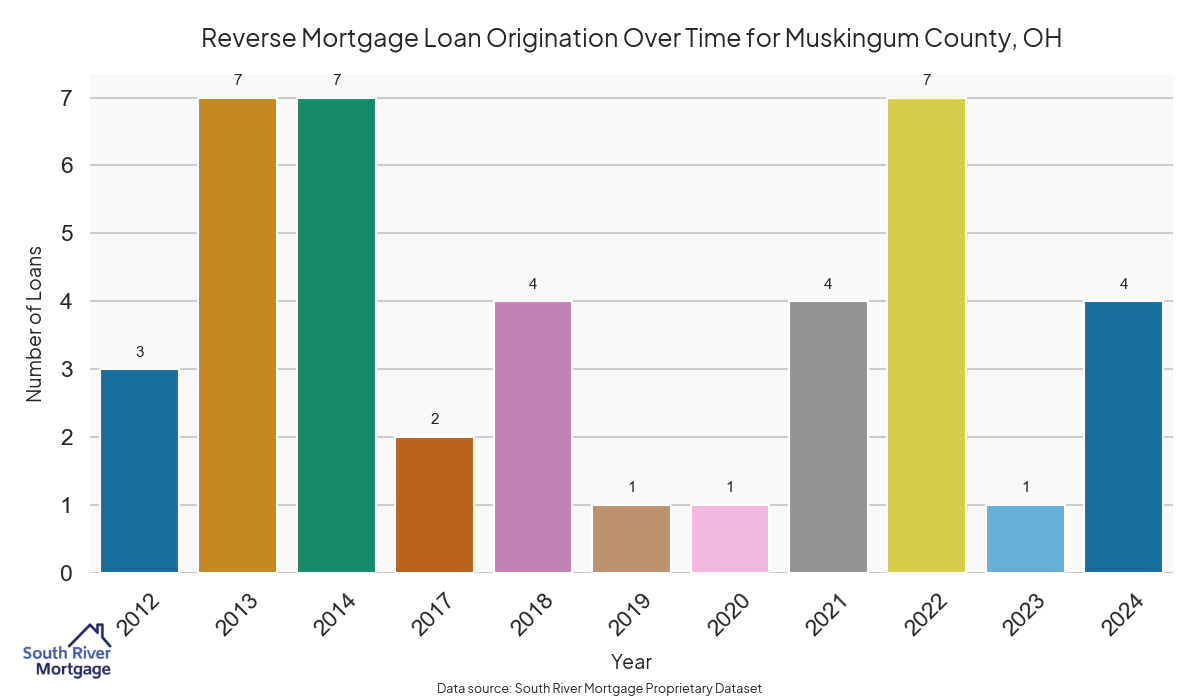 In 2024, there were 36 active reverse mortgage loans in Muskingum County, Ohio. The average home value in Muskingum County is $204,983.06.