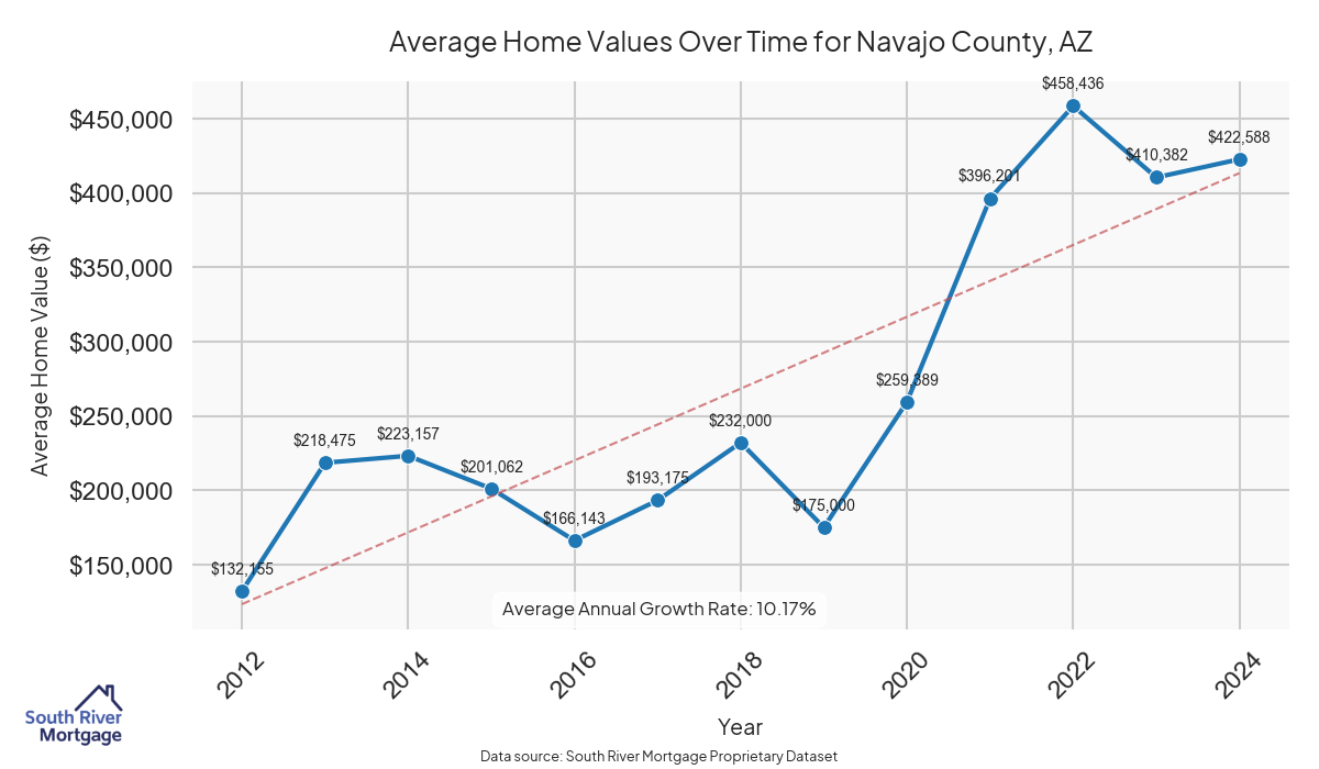 In 2024, there were 160 active reverse mortgage loans in Navajo County, Arizona. The average home value in Navajo County is $481,229.46.