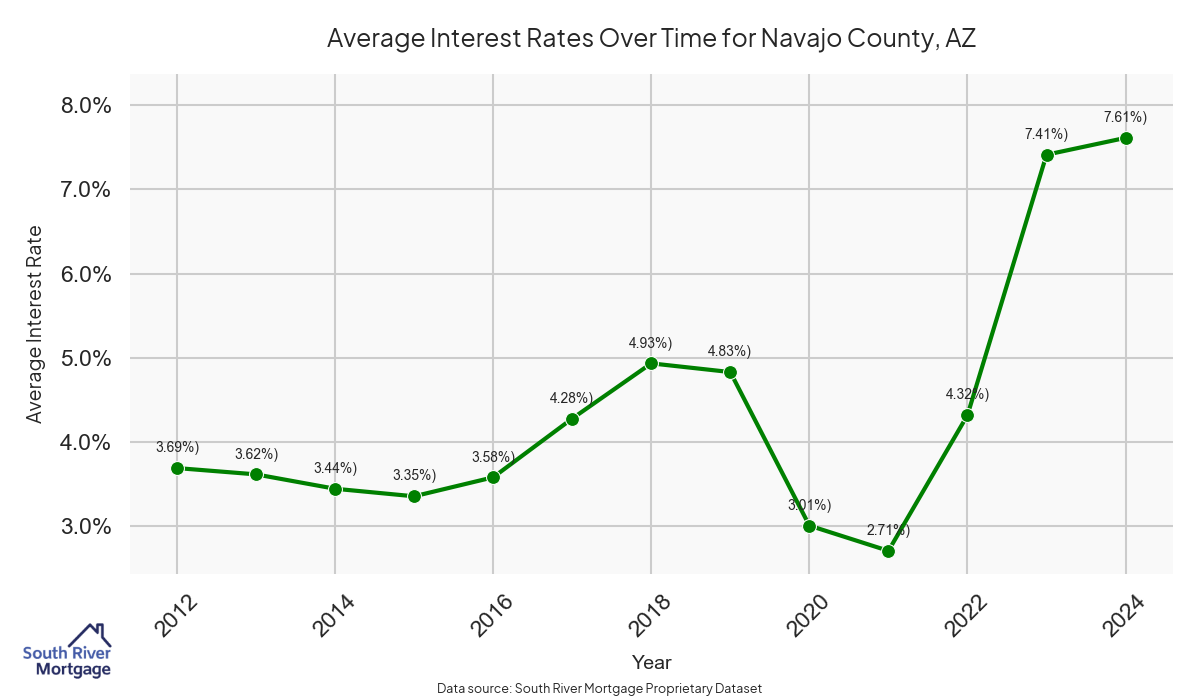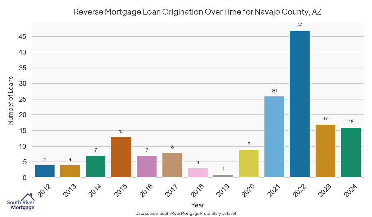 There are approximately 160 active reverse mortgage loans in Navajo County. The average interest rate in Navajo County is 7.21% for reverse mortgages. The average maximum claim amount (the lesser of the appraisal or lending limit), among reverse mortgage borrowers, in Navajo County was $427,222.22 in 2024.
