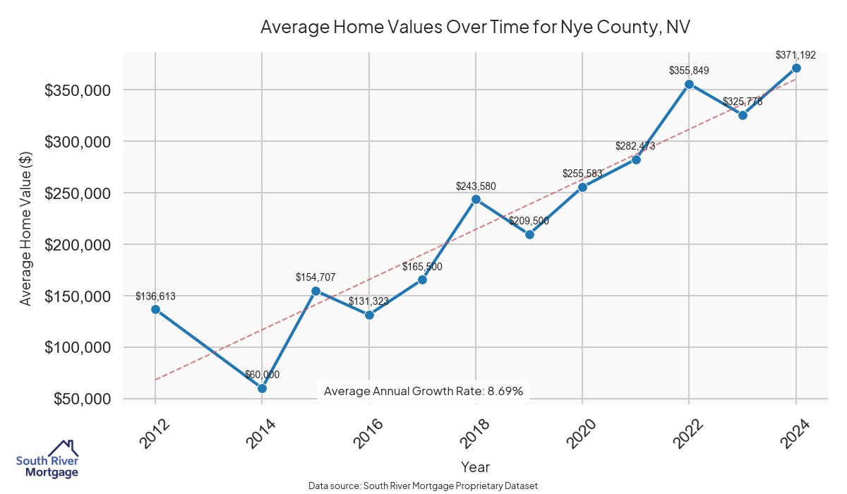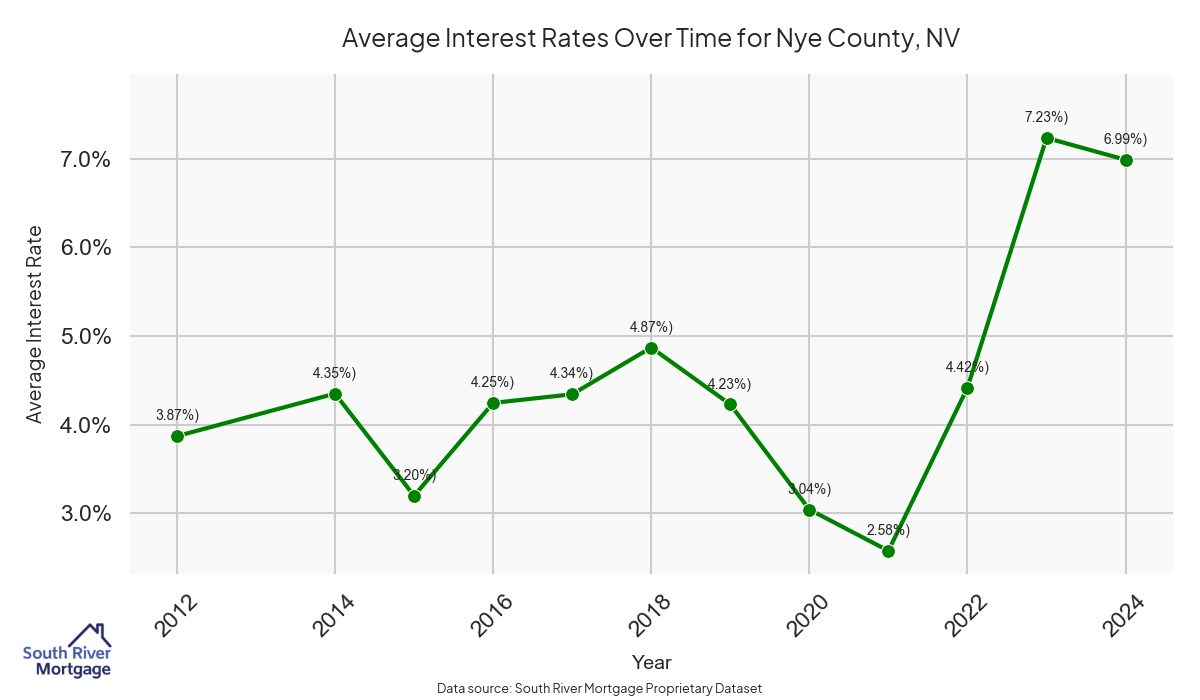 There are approximately 160 active reverse mortgage loans in Nye County. The average interest rate in Nye County is 7.58% for reverse mortgages. The average maximum claim amount (the lesser of the appraisal or lending limit), among reverse mortgage borrowers, in Nye County was $360,789.47 in 2024.