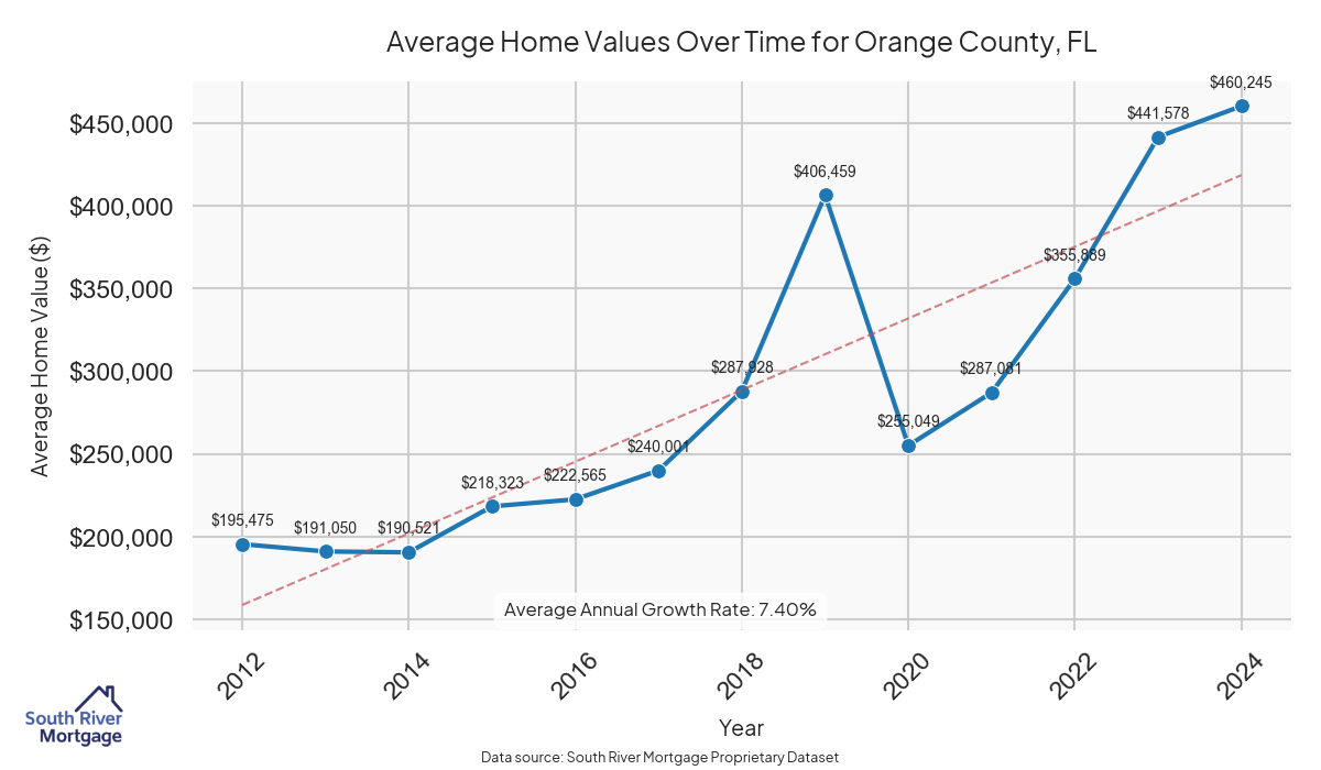 In 2024, there were 1180 active reverse mortgage loans in Orange County, Florida. The average home value in Orange County is $479,056.60.