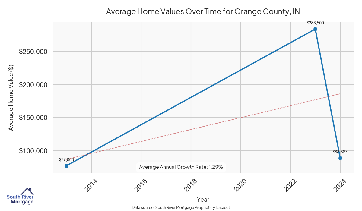 In 2024, there were 3 active reverse mortgage loans in Orange County, Indiana. The average home value in Orange County is $272,589.33.