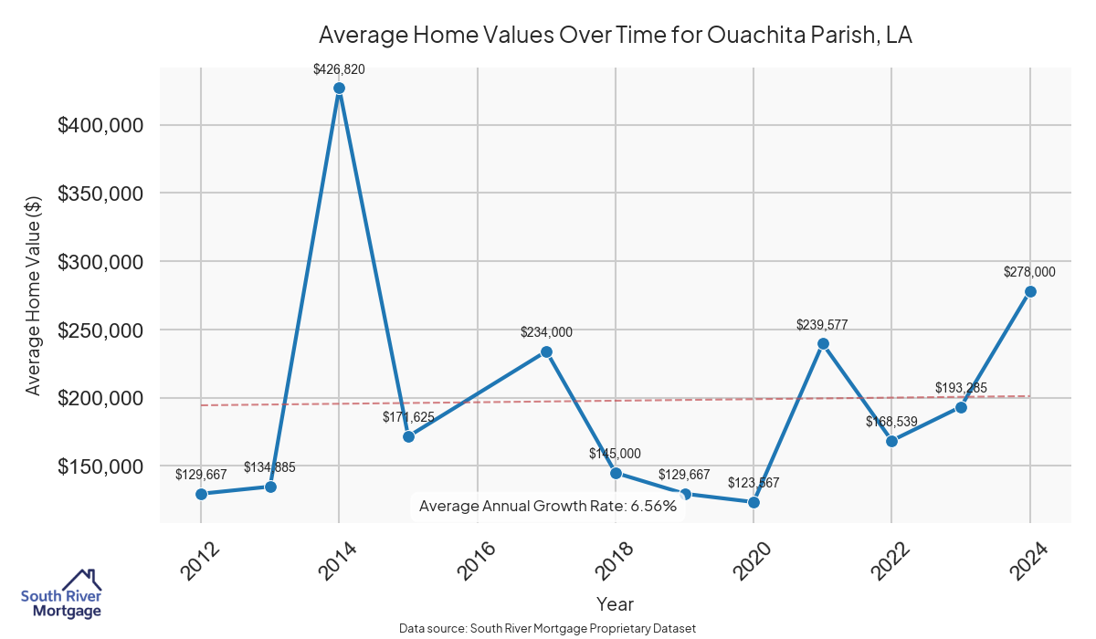 In 2024, there were 77 active reverse mortgage loans in Ouachita Parish, Louisiana. The average home value in Ouachita Parish is $193,153.29.