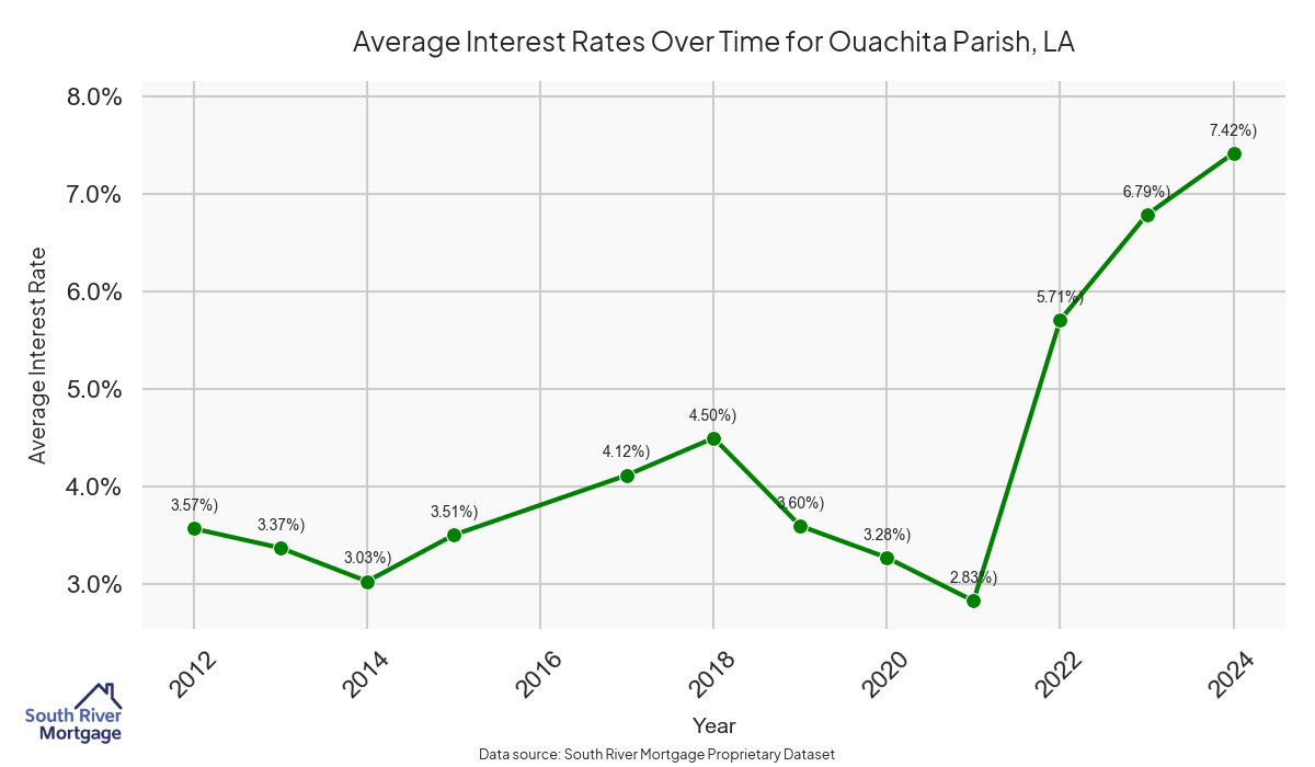 There are approximately 77 active reverse mortgage loans in Ouachita Parish. The average interest rate in Ouachita Parish is 7.83% for reverse mortgages. The average maximum claim amount (the lesser of the appraisal or lending limit), among reverse mortgage borrowers, in Ouachita Parish was $210,384.62 in 2024.