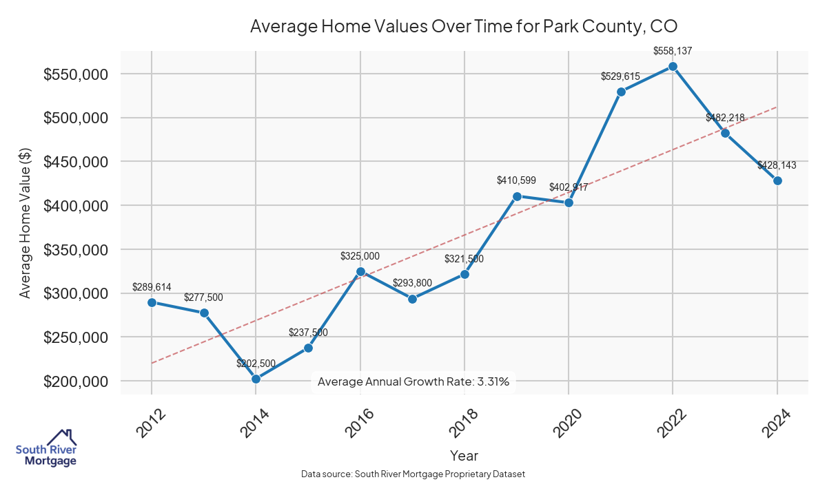 In 2024, there were 110 active reverse mortgage loans in Park County, Colorado. The average home value in Park County is $613,793.70.