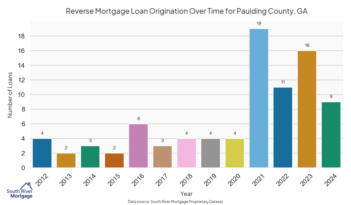 In 2024, there were 87 active reverse mortgage loans in Paulding County, Georgia. The average home value in Paulding County is $358,568.86.