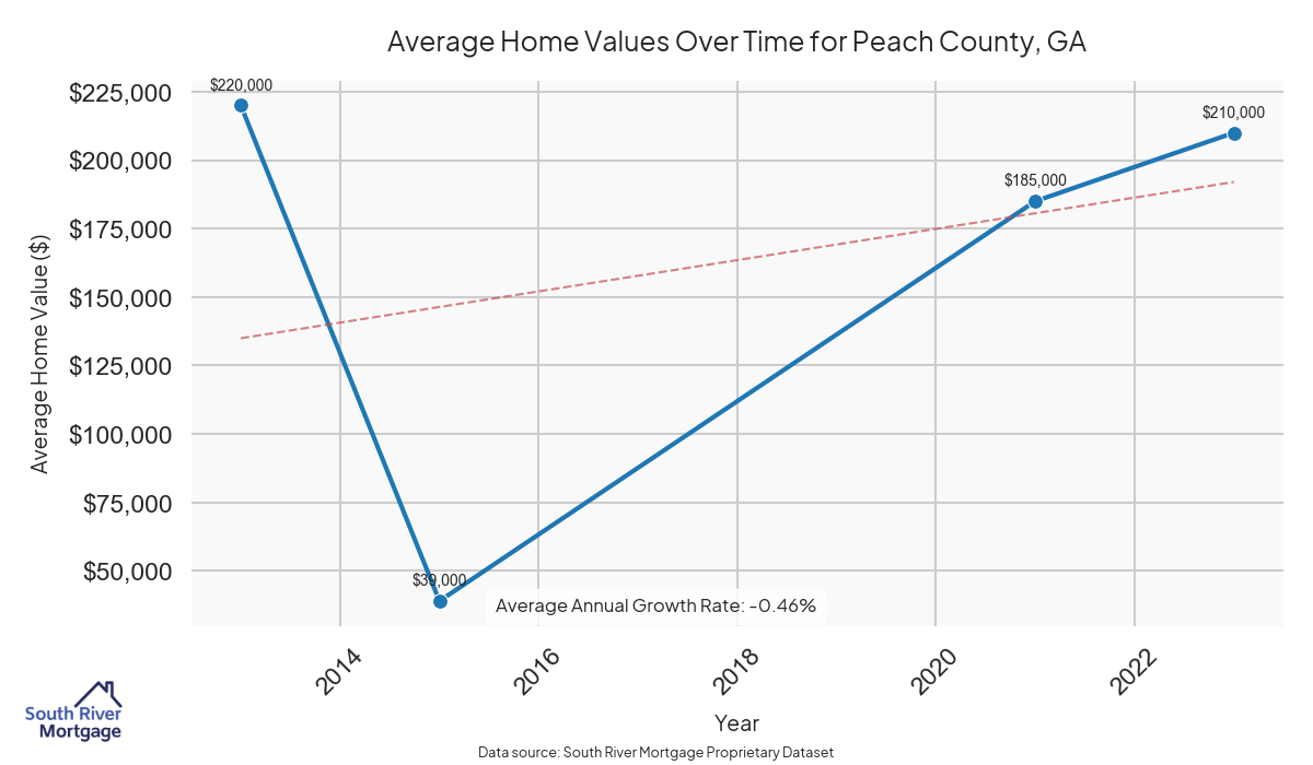 In 2024, there were 4 active reverse mortgage loans in Peach County, Georgia. The average home value in Peach County is $306,855.25.