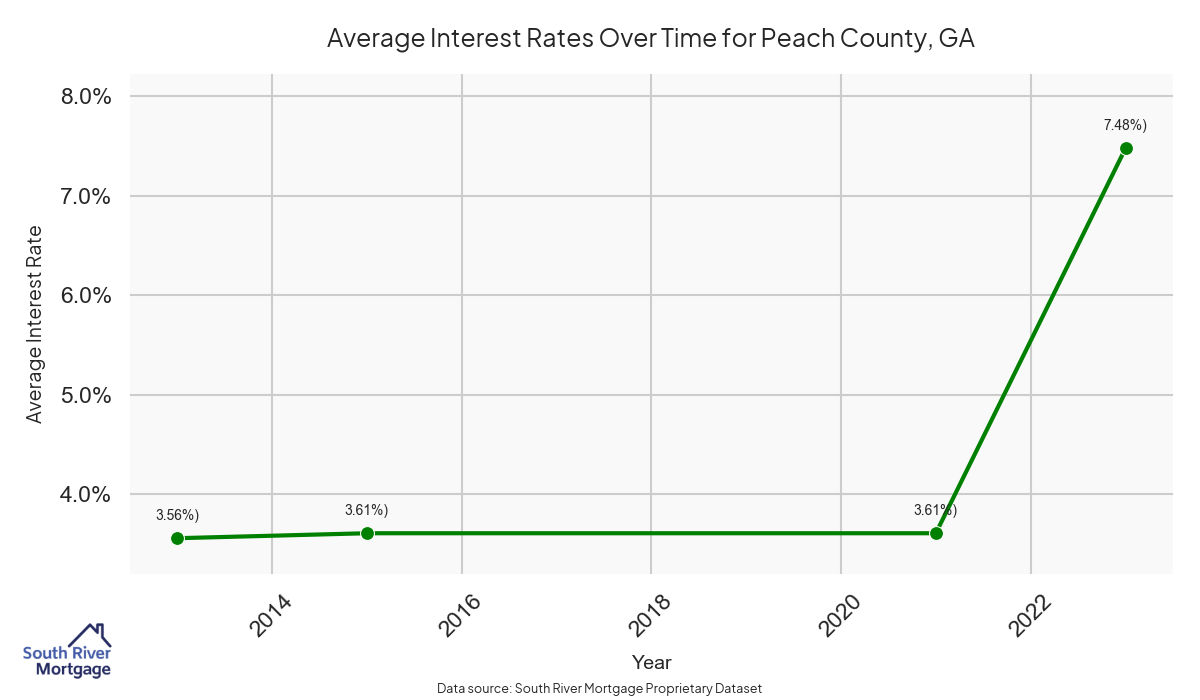 There are approximately 4 active reverse mortgage loans in Peach County. The average interest rate in Peach County is 7.6% for reverse mortgages. The average maximum claim amount (the lesser of the appraisal or lending limit), among reverse mortgage borrowers, in Peach County was $230,000.00 in 2024.