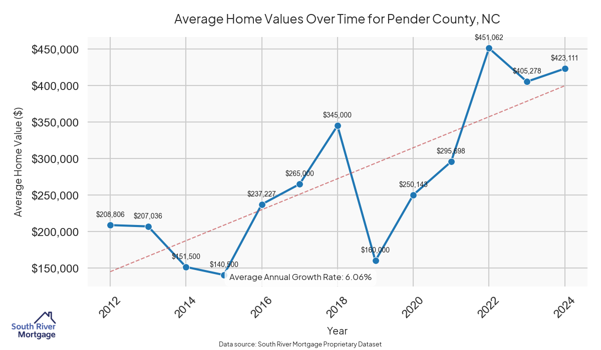 In 2024, there were 64 active reverse mortgage loans in Pender County, North Carolina. The average home value in Pender County is $456,132.45.