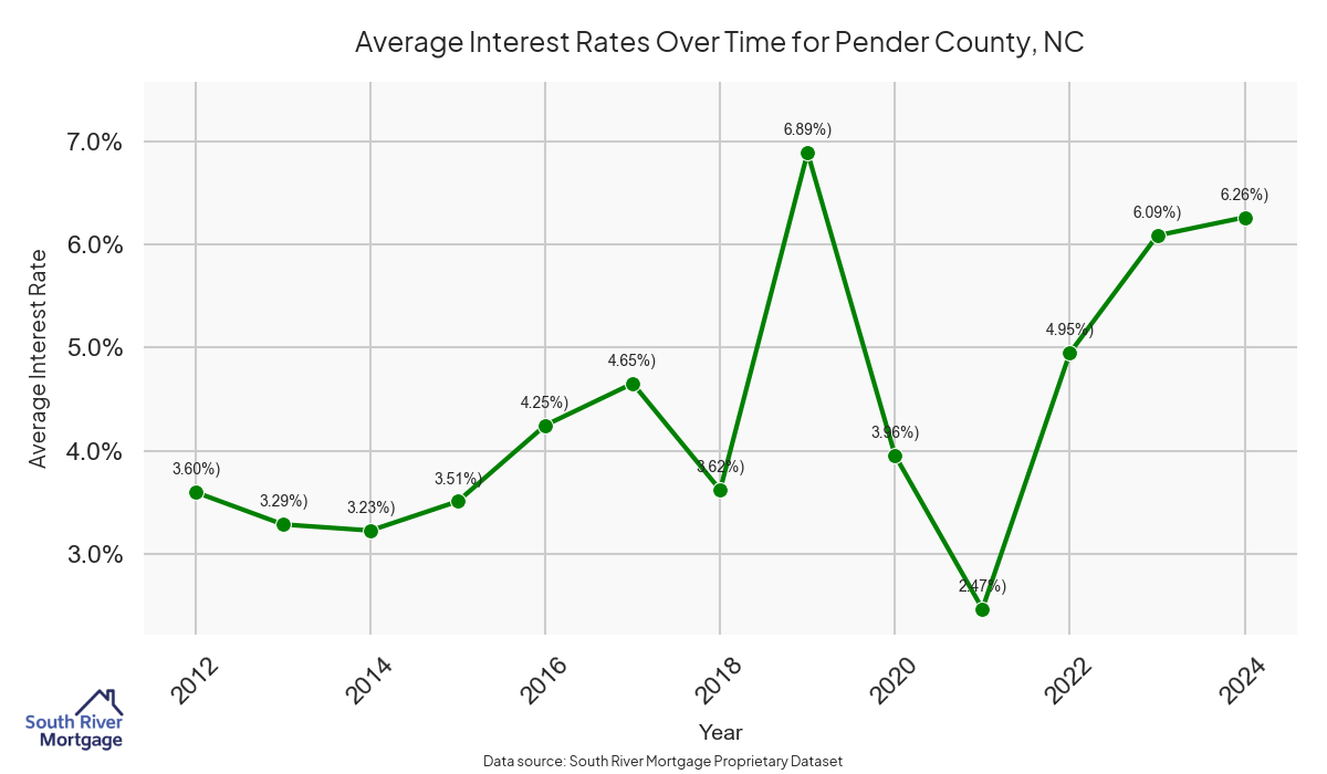There are approximately 64 active reverse mortgage loans in Pender County. The average interest rate in Pender County is 7.3% for reverse mortgages. The average maximum claim amount (the lesser of the appraisal or lending limit), among reverse mortgage borrowers, in Pender County was $379,000.00 in 2024.
