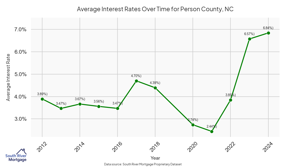 There are approximately 24 active reverse mortgage loans in Person County. The average interest rate in Person County is 6.94% for reverse mortgages. The average maximum claim amount (the lesser of the appraisal or lending limit), among reverse mortgage borrowers, in Person County was $405,000.00 in 2024.