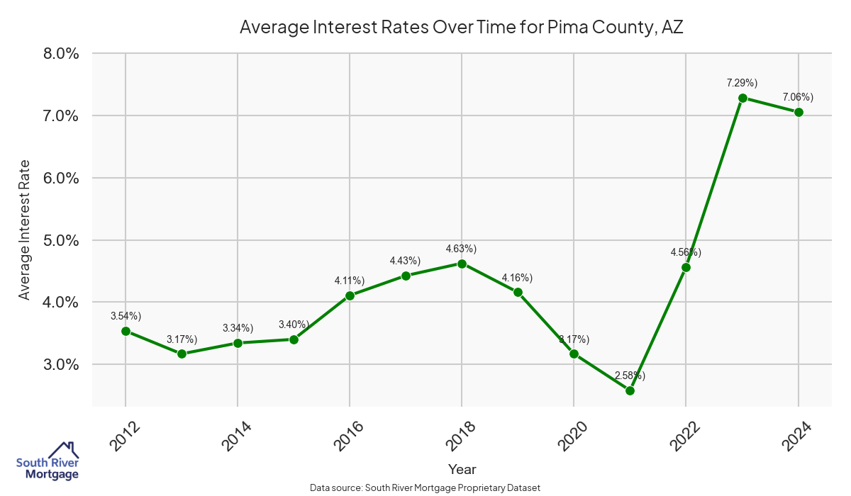 There are approximately 1655 active reverse mortgage loans in Pima County. The average interest rate in Pima County is 7.34% for reverse mortgages. The average maximum claim amount (the lesser of the appraisal or lending limit), among reverse mortgage borrowers, in Pima County was $394,016.39 in 2024.