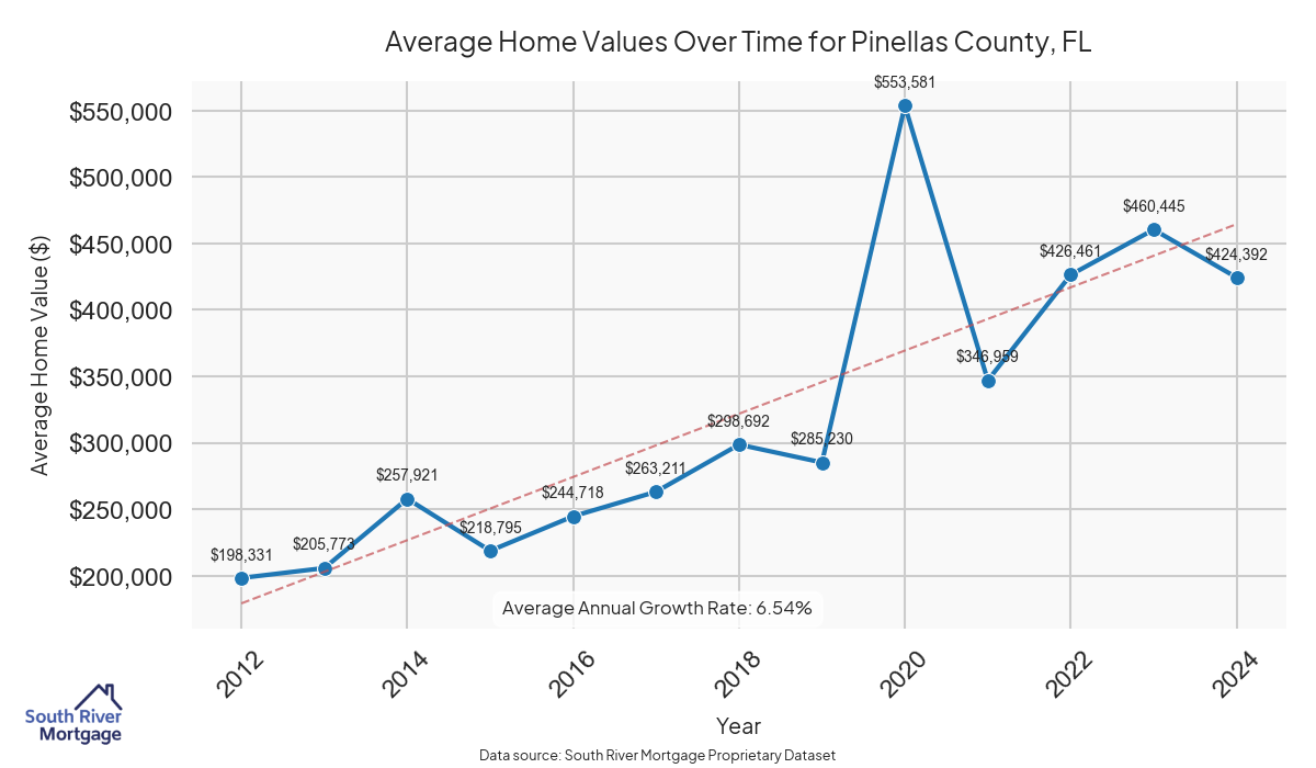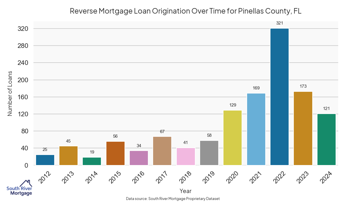 In 2024, there were 1252 active reverse mortgage loans in Pinellas County, Florida. The average home value in Pinellas County is $524,381.19.