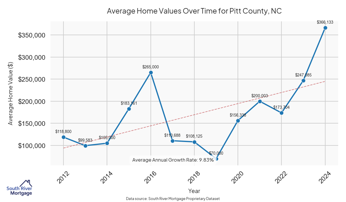 In 2024, there were 81 active reverse mortgage loans in Pitt County, North Carolina. The average home value in Pitt County is $263,829.01.