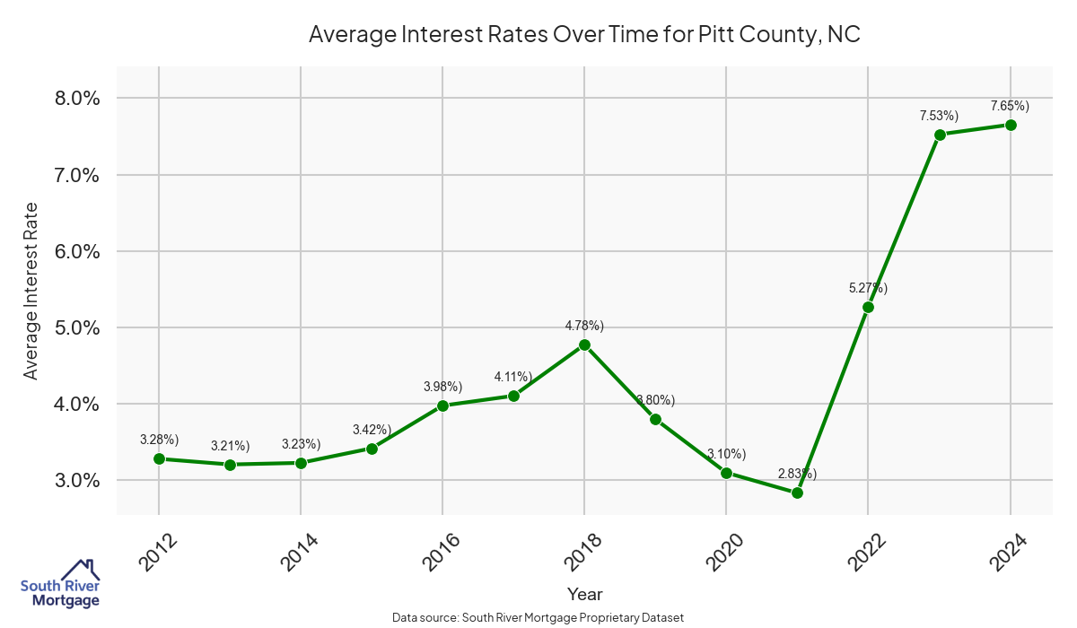 There are approximately 81 active reverse mortgage loans in Pitt County. The average interest rate in Pitt County is 7.65% for reverse mortgages. The average maximum claim amount (the lesser of the appraisal or lending limit), among reverse mortgage borrowers, in Pitt County was $261,428.57 in 2024.