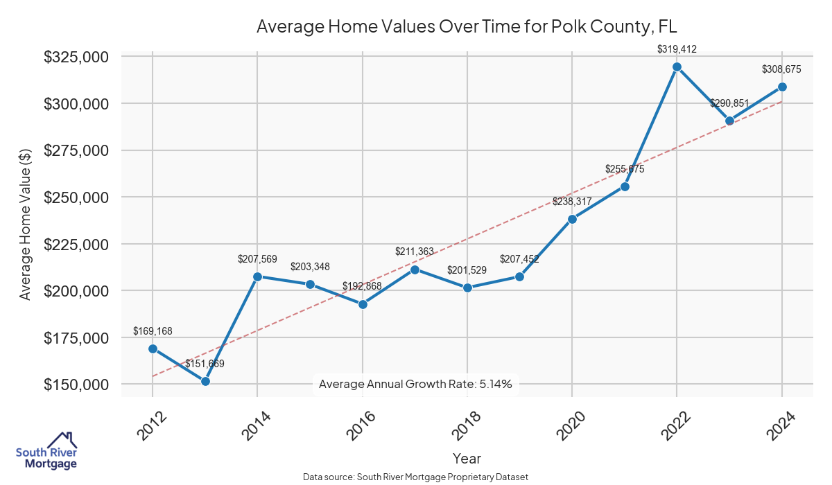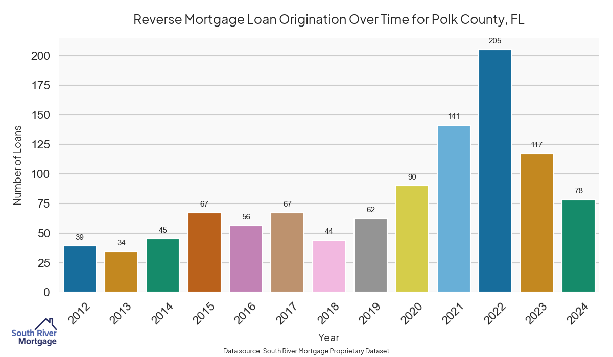 In 2024, there were 1040 active reverse mortgage loans in Polk County, Florida. The average home value in Polk County is $345,577.55.