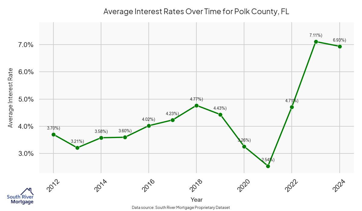 There are approximately 1040 active reverse mortgage loans in Polk County. The average interest rate in Polk County is 7.52% for reverse mortgages. The average maximum claim amount (the lesser of the appraisal or lending limit), among reverse mortgage borrowers, in Polk County was $304,516.13 in 2024.