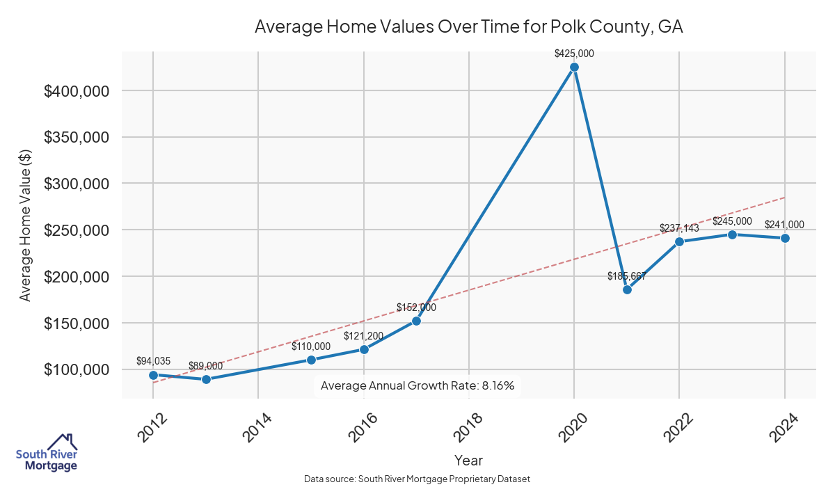 In 2024, there were 23 active reverse mortgage loans in Polk County, Georgia. The average home value in Polk County is $229,451.43.