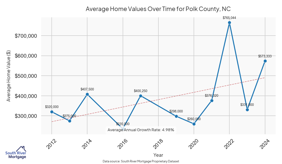 In 2024, there were 26 active reverse mortgage loans in Polk County, North Carolina. The average home value in Polk County is $531,079.92.